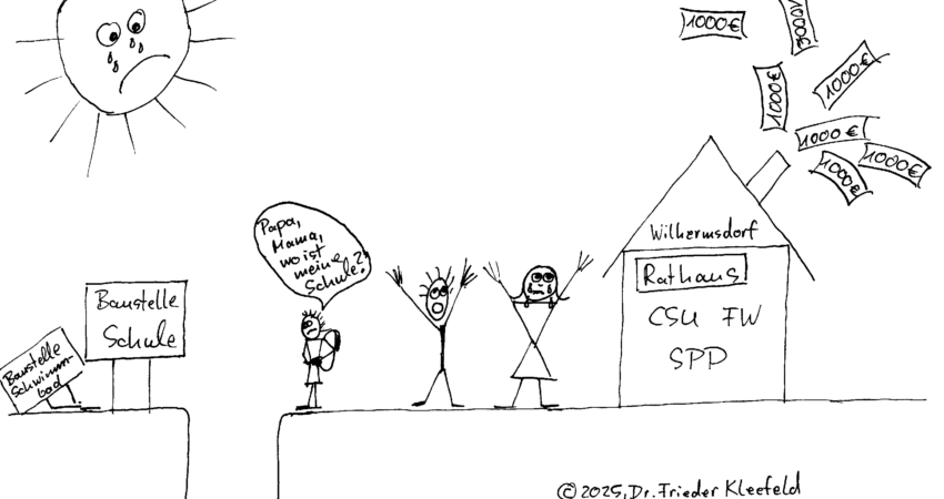 Derzeit wird von Seiten des Bürgermeisters behauptet, wir würden hier mit 43 Millionen € falsche Zahlen über die Kosten eines Schulneubaus nach dem ursprünglichen Plänen der Leistungsphase 3 in Raum stellen. Dies ist nicht richtig! Im öffentlichen Teil der Marktgemeinderatssitzung vom 20.02.2025 legte der Bürgermeister den Quartals-/Monatsbericht Q1/Februar 2025 der Bayern Grund vor, in dem schwarz auf weiß nachzulesen ist, dass die Gesamtkostenprognose für die Neukonzeptionierung des Schulzentrums Wilhermsdorf 43.195.407 € beträgt. Dies deckt sich mit den Zahlen, die vom Bürgermeister im öffentlichen Teil der Marktgemeinderatssitzung vom 21.11.2025 vorgestellt wurden, welche besagen, dass der komplette Schulneubau 34.995.407,18 € samt 8 Millionen Euro Finanzierung gekostet hätte. Nachdem der Marktgemeinderat Anfang 2025 zu einer Umplanung des Schulprojekts gezwungen wurde, bei der nun nur die Grundschule neu gebaut wird und die Mittelschule erhalten bleibt – dies entspricht dem Antrag der Grünen Fraktion vom 10.12.2023 mit dem Unterschied, dass die alte Schulturnhalle abgerissen ist –, konnte der Bürgermeister nun im öffentlichen Teil der Marktgemeinderatssitzung vom 21.11.2025 eine neue Kostenschätzung für den Neubau der Grundschule von 22.240.504,15 € OHNE Finanzierungskosten vorlegen, die deutlich niedriger ausfällt als die Kosten des ursprünglichen Neubaus von Grund- und Mittelschule. Nichtsdestotrotz musste er in derselben Sitzung der Öffentlichkeit zugeben, dass mindestestens 2 Millionen Euro Planungskosten für den Schulneubau verloren sind! Nicht zu vergessen sind hier zusätzliche Planungskosten für den Neubau eines Schwimmbads am Schulstandort, welches nie realisiert wurde, und die Abbruchkosten der alten Schulturnhalle.